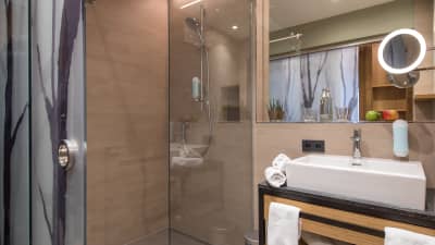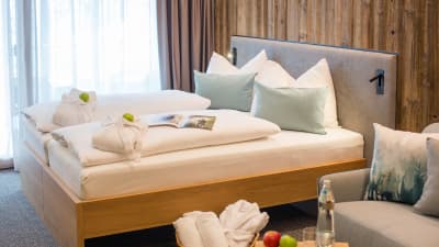 There are a variety of comfortable guest rooms standard rooms have Austrian twin beds, Junior Suites are in the annexe building which is new and linked to the main hotel by an underground walkway and they offer a large bedroom with an additional sofa bed and a sitting room area, balcony, hairdryer, mini-bar, radio, telephone, cable TV and guest safe. Quad rooms offer a large sleeping area with a couch bed or bunk beds for 3rd and 4th person. The Twin rooms have a sloping ceiling.